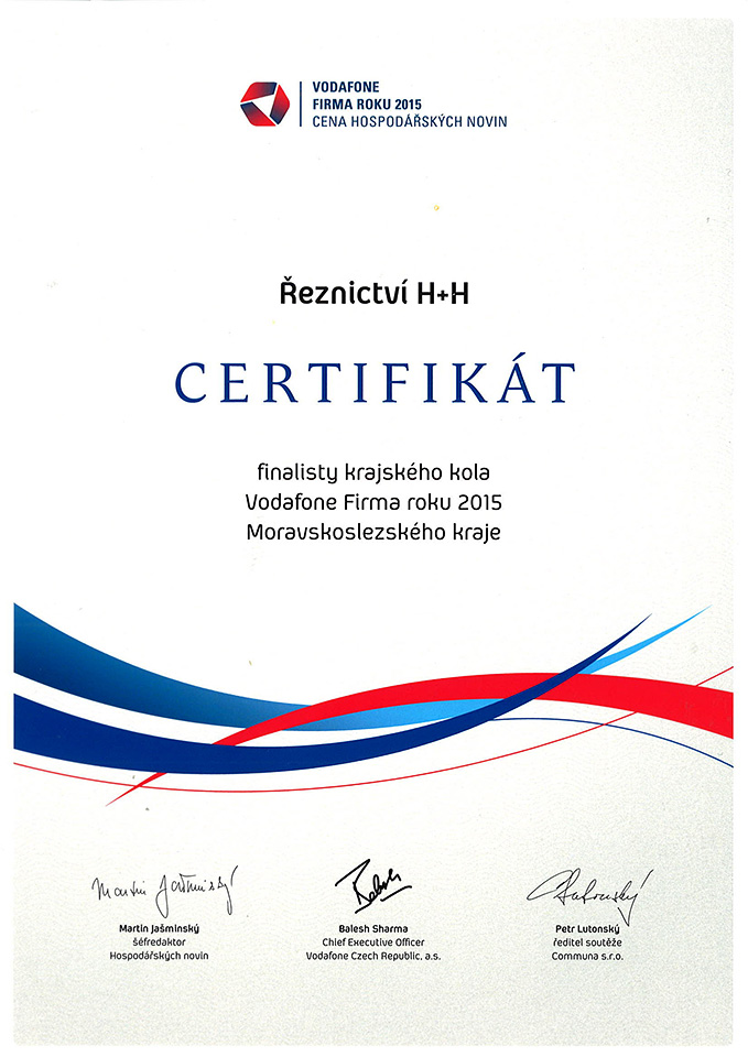 Dne 22. 10. 2015 proběhlo v Ostravě vyhlášení nejlepších firem a živnostníků Moravskoslezského kraje za rok 2015. V letošním roce do této soutěže bylo nominováno celkem 242 firem. Jednou z nich bylo také Řeznictví H+H, s.r.o.