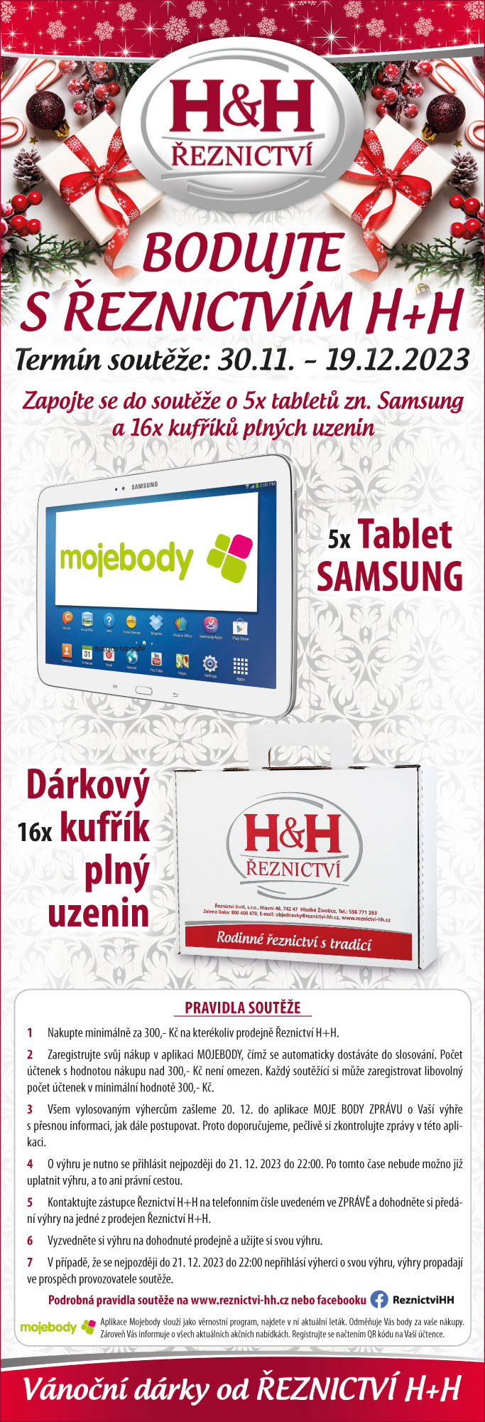 Od 30. 11. 2023 do 19. 12. 2023 máme na všech prodejnách řeznictví H+H pro vás připravenou velkou předvánoční soutěž o hodnotné ceny - Bodujte s Řeznictvím H+H 2023