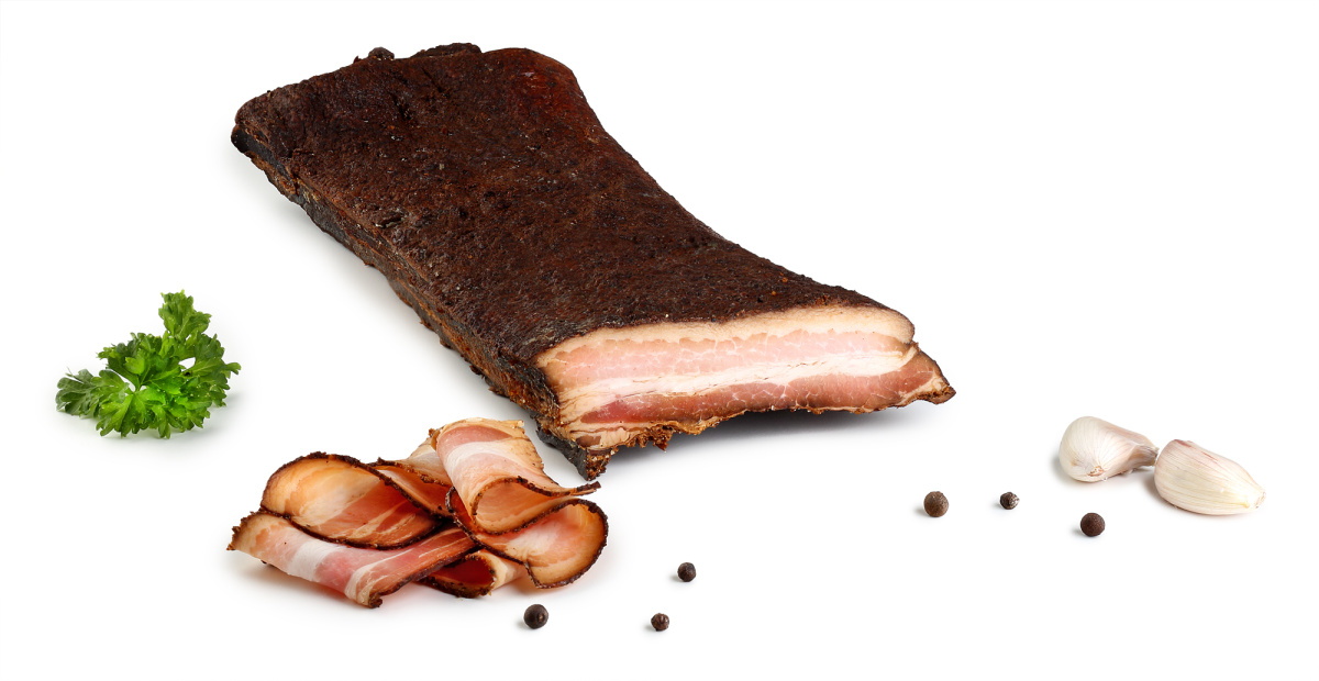 Vepřový bok (92%), pitná voda, extrakty koření, antioxidant E301, jedlá sůl, stabilizátory E450, E451, dextróza, konzervanty E250, látka zvýrazňující chuť a vůni E621, cukr, kouřové aroma.