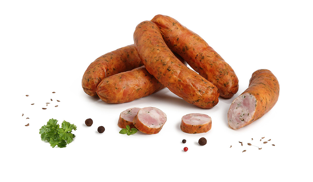 Vepřové maso (68%), voda, jedlá sůl s jodem (jedlá sůl, jodičnan draselný), konzervanty E250, E535, stabilizátory E339, E450, E451, E452, antioxidant E301, koření, dextróza, glukózový sirup, kvasniční extrakt, pažitka, extrakty koření, sušená zelenina medvědí česnek (1%), látka zvýrazňující chuť a vůní E621, jedlé střevo - vepřové