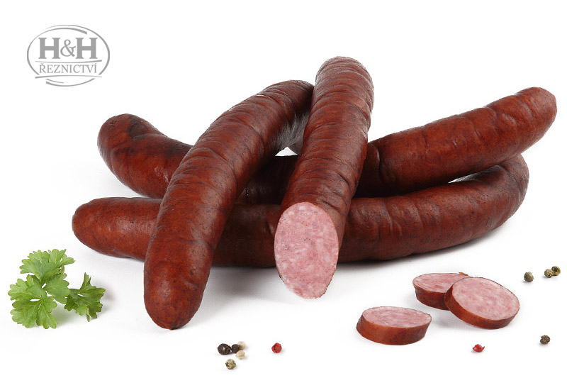 Vepřové maso (60%), hovězí maso (31%), pitná voda, jedlá sůl s jodem (jedlá sůl jodičnan draselný), konzervanty E250, E500, sušený česnek, stabilizátory E450, E451, směs koření, antioxidant E316, látka zvýrazňující chuť a vůni E621, zahušťovadla - cukry, barvivo E150d