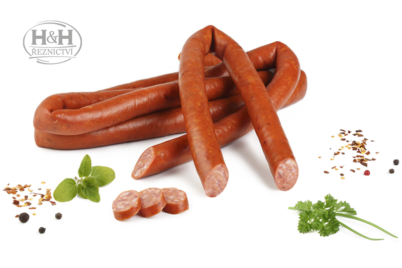 Vepřové maso (48%), voda, kůžová emulze (vepřové kůže, voda stabilizátory E327, E331), bramborový škrob, jedlá sůl s jodem (jedlá sůl, jodičnan draselný), nkonzervanty E250, E500, stabilizátory E450, E451, směs koření, antioxidant E316, barvivo E120, E 160c, látka zvyšující chuť a vůni E621