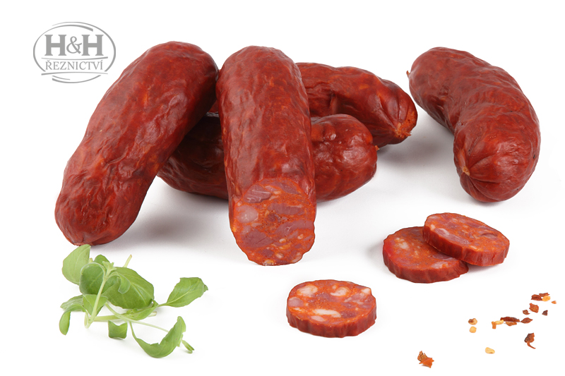 Vepřové maso (40%), vepřové sádlo (28%), hovězí maso (15%), živočišná bílkovina (vepřová), pitná voda, jedlá sůl s jodem (jedlá sůl, jodičnan draselný) konzervant E 250, E 535, koření sušená zelenina, extrakty koření, stabilizátor E 451, barvivo E 120, antioxidant E 316, emulgátor E 322, jedlé střevo vepřové.