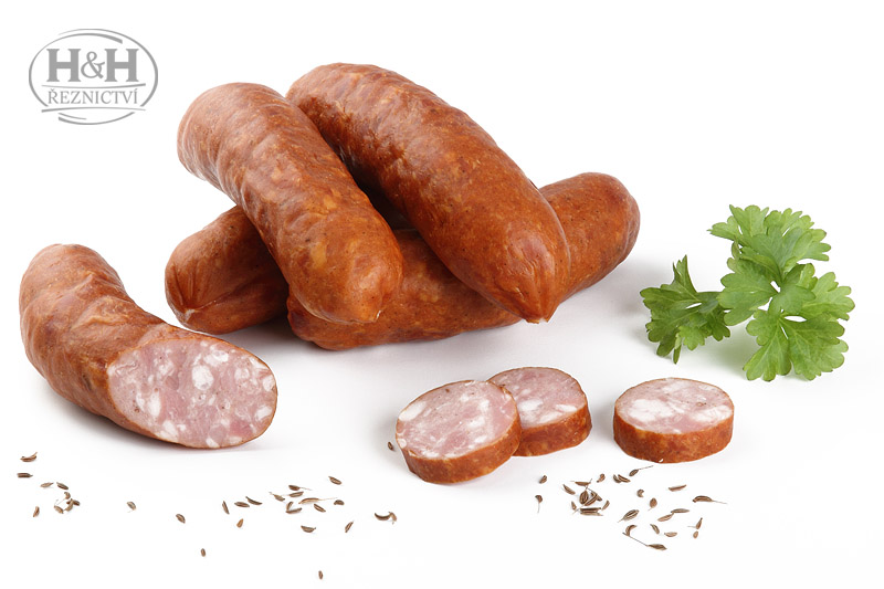 Vepřové maso (64%), voda, kůžová emulze (vepřové kůže, voda, stabilizátory E327, E330, E331, látka zvyšující chuť a vůni E270, zahušťovadlo E412, konzervant E500), jedlá sůl jódovaná (jedlá sůl, jodičnan draselný), směs koření, koření česnek, anitoxidant E301, kmín (1%) bramborový škrob, barvivo E120, koření, konzervanty E250, E500, E535, stabilizátor E451, E339, zahušťovadlo E407a, látky zvýrazňující chuť a vůní E621, E635, jedlé střevo - vepřové.