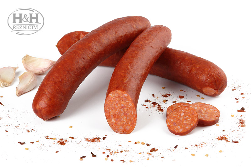 Vepřové maso (60%), vepřová bílkovina, vařené vepřové kůže, bramborový škrob, jedlá sůl s jodem (jedlá sůl, jodičnan draselný) konzervanty E250, E535, E202, stabilizátory E339, E450, E451, E452, glukózový sirup, kvasniční extrakt, cukr, extrakty koření, emulgátor E472c, zahušťovadla E1422, E407a, látky zvýrazňující chuť a vůni E621, E635, regulátor kyselosti E508, E260, anitoxidanty E301, E316, sušená zelenina, koření, jedlé střevo – vepřové.