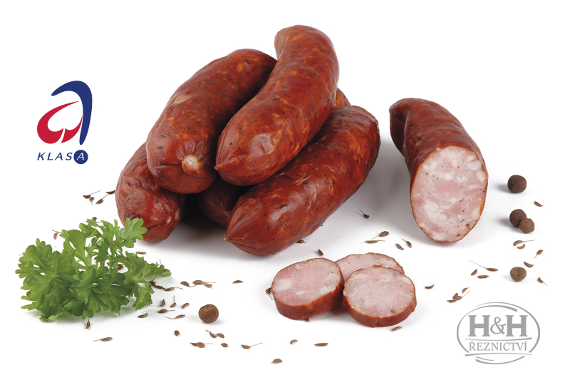 Vepřové maso, voda, jedlá sůl s jodem (jedlá sůl, jodičnan draselný), konzervanty E250, E536, stabilizátory E450, E451, E452, E339, sušený česnek, pepř černý, kmín, dextróza, antioxidat E301, látka zvýrazňující chuť E 621, jedlé střevo – vepřové.