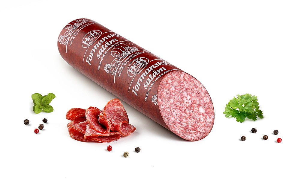 Vepřové maso (59%), vepřové sádlo, jedlá sůl s jodem (jedlá sůl, jodičnan draselný), konzervanty E250, E535, E202,