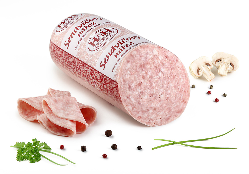 Vepřové maso (62%), voda, kůžová emulze (vepř.kůže, voda, stabilizátory E327, E330, E331, regulátor kyselosti E270, zahušťovadlo E412, konzervant E500), modifikovaný škrob E1422, jedlá sůl s jodem, (jedlá sůl, jodičnan draselný), konzervanty E250, E535 česnek, koření, antioxidant E316, stabilizátory E450, E451, barvivo E120, kvasniční extrakt, zahušťovadlo E407a, látky zvýrazňující chuť a vůní E621, E635, sůl E508, střevo není jedlé
