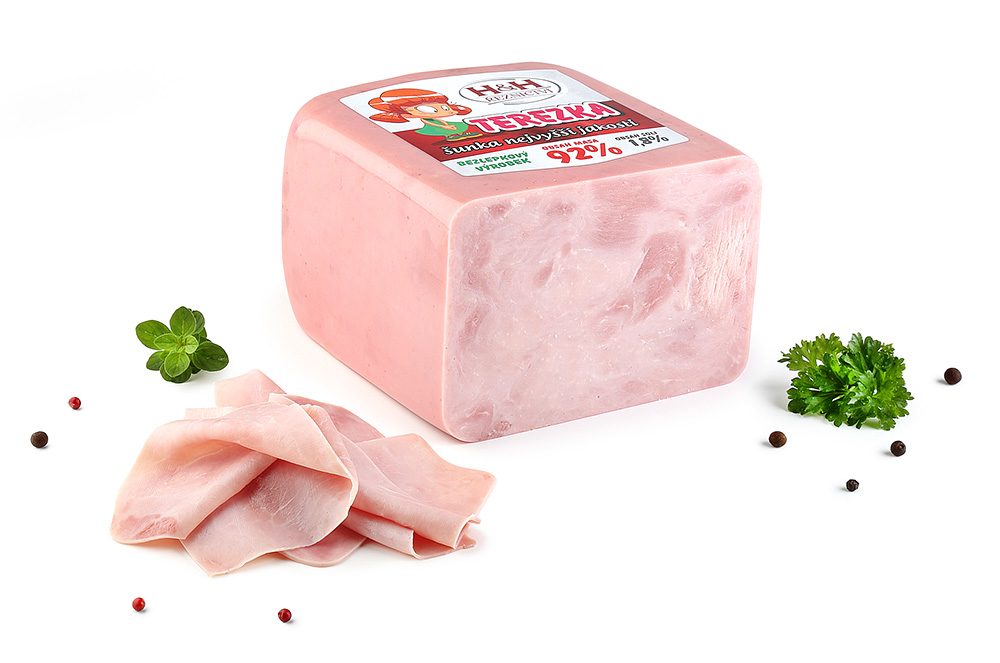 Vepřové maso (92%), voda, jedlá sůl s jodem (jedlá sůl, jodičnan draselný) konzervanty E250, E535, E330, stabilizátory E450, E451, antioxidant E301, zahušťovadlo E407a, glukozový sirup , cukr, kvasniční extrakt, extrakty koření, aroma.