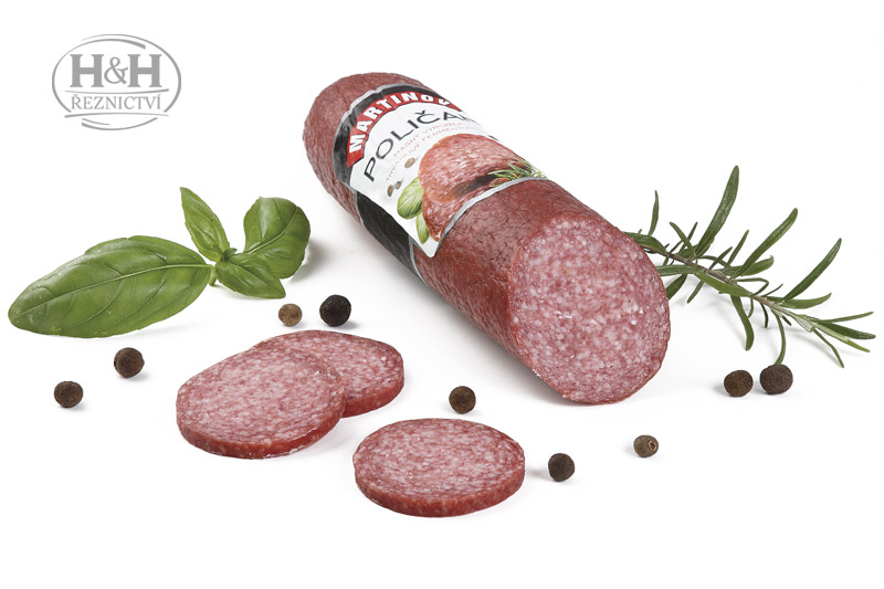 vepřové maso, vepřové sádlo, jedlá sůl s jodem (jedlá sůl, jodičnan draselný), koření, extrakty koření, glukózový sirup, startovací kultura mikroorganismů, dextróza, extrakt z červené řepy, konzervant E250, antioxidant E316, barvivo E120, kouřové aroma. Střevo není jedlé.